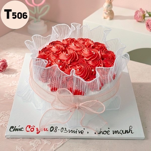 Mẫu T506 là một tác phẩm nghệ thuật với phần mặt bánh phủ kín bởi những đóa hồng kem màu đỏ nhung đậm đà. Mỗi bông hoa được bắt cánh cầu kỳ, xen kẽ là những hạt ngọc trai bạc lấp lánh như sương sớm.