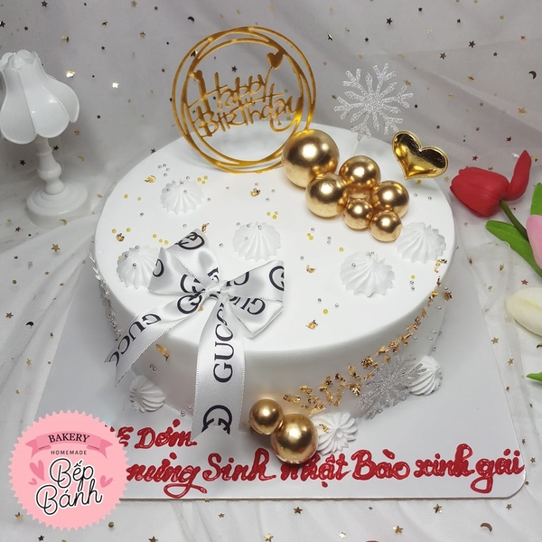 Bánh sinh nhật màu trắng trang trí phụ kiện sang trọng vàng gold