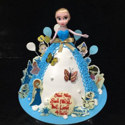 Hay chiếc bánh sinh nhật nữ hoàng băng giá Elsa với quyền phép đóng băng tất cả mọi thứ bước ra từ phim hoạt hình Frozen làm mưa làm gió các phòng vé năm 2013. Chiếc bánh kem Elsa Anna được làm cực kỳ tỉ mỉ, nhất là bộ váy kỳ công 2 màu xanh trắng đính kèm vô số những họa tiết xinh xắn dành cho bé gái như bươm bướm, hoa hòe.