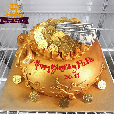 Những chiếc bánh kem bằng vàng ngoài trang trí bởi những thỏi bạc, đồng tiền vàng thì còn được tô điểm thêm bằng những tờ đô la, khiến cho chiếc bánh sinh nhật hũ vàng trở nên sang trọng và hiện đại hơn rất nhiều.