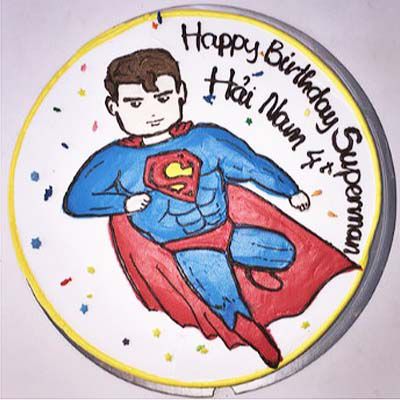 Chiếc bánh sinh nhật vẽ hình superman tái họa lại cực sinh động anh chàng Superman mạnh mẽ, cao ráo và bộ trang phục quen thuộc 2 màu xanh - đỏ cùng logo hình viên kim cương quen thuộc với fan của anh chàng này.